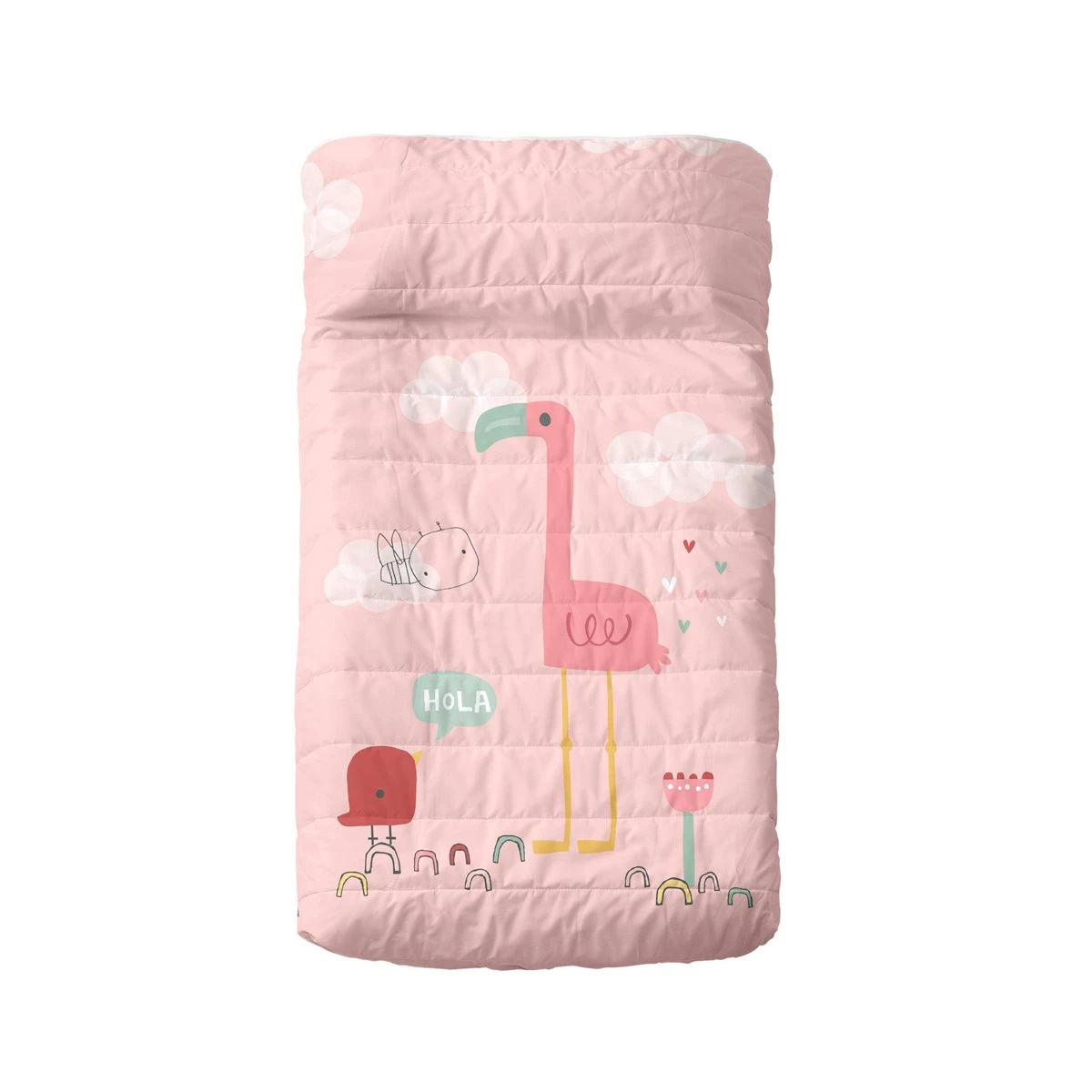 ¿Quién es ese pájaro de cuello largo con patas en forma de palo y plumas rosadas? Presenta a tu hijo el maravilloso y simpático mundo rosado de los flamencos y sus amigos de la laguna con la colcha Hola de Moshi Moshi. Los colores intensos y sólidos impresos en algodón 100% permanecerán constantes gracias a la impresión digital de alta definición. Ideal para cambios de estación. Acolchado en forma de rayas. El relleno es 100% poliéster de fibra hueca siliconada de 100 Gr. Incluye: – 1 x Colcha colcha 100×130 [Cuna].