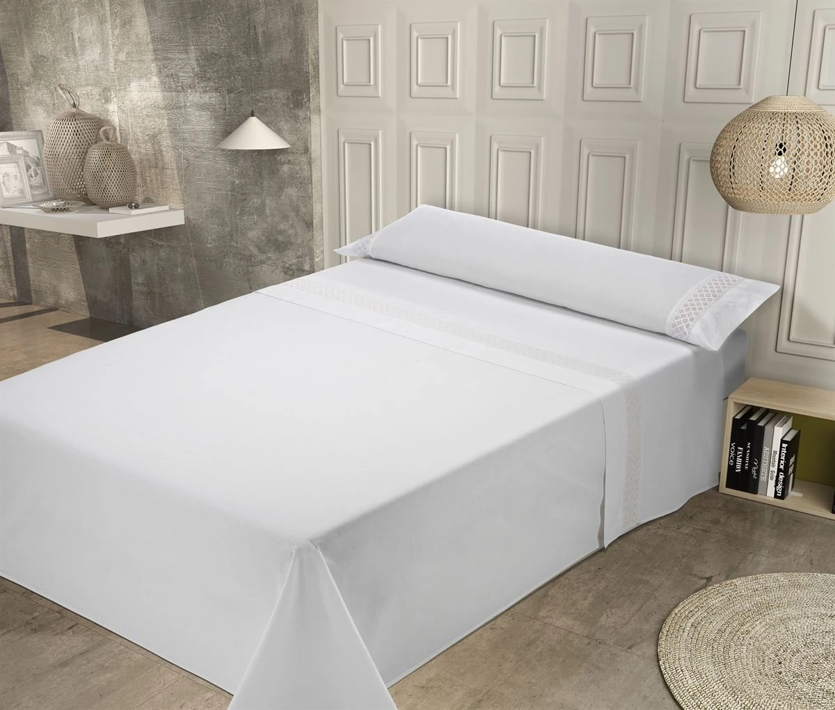 - Cama 180: Encimera 250×270 cm; Bajera: 180×200+28 cm; Funda almohada: 2-45×105